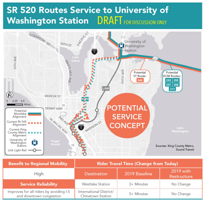 One of the first ideas that was proposed was improving Montlake triangle to speed up bus transfers there, allowing buses that currently use SR-520 and go all the way downtown to instead transfer riders to and from the University of Washington station. The documentation suggested that this would save riders three minutes if heading to the vicinity of Westlake Station and five minutes if heading to the International District, compared to what expected bus times will be in 2019 with additional buses on surface streets.