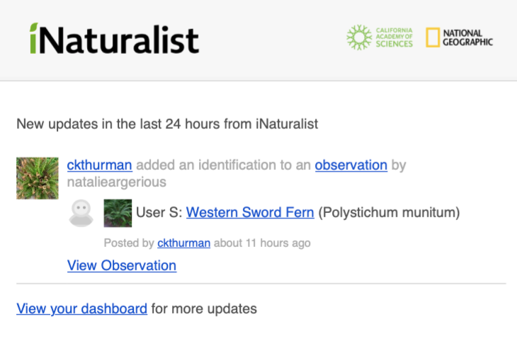 Technology can distract us, but it can also be used to bring us closer to the things, like nature, which really matter in our lives. So take a moment to download the iNaturalist app. Who knows… you may end up documenting a rare or endangered species. Or — like me — you might finally get on a first name basis with the wildlife that colors your life. Hello, Western Sword Fern!