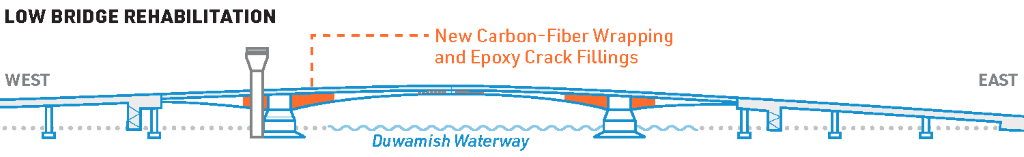 The estimated $72 million cost of bridge rehabilitation will pay for proven construction methods to ready the high bridge for return of traffic and the low bridge to last for the remainder of its lifespan. Much of the work will be similar to what was done in phase one, with carbon-fiber wrapping, epoxy crack filling, and post tensioning work. New work will include Pier 18 ground stabilization for seismic improvements, though this work isn’t necessary prior to bridge reopening. SDOT is also considering possible repair projects on the broader corridor, and inspection of the center-lock system on the lower bridge to see if that needs repair.