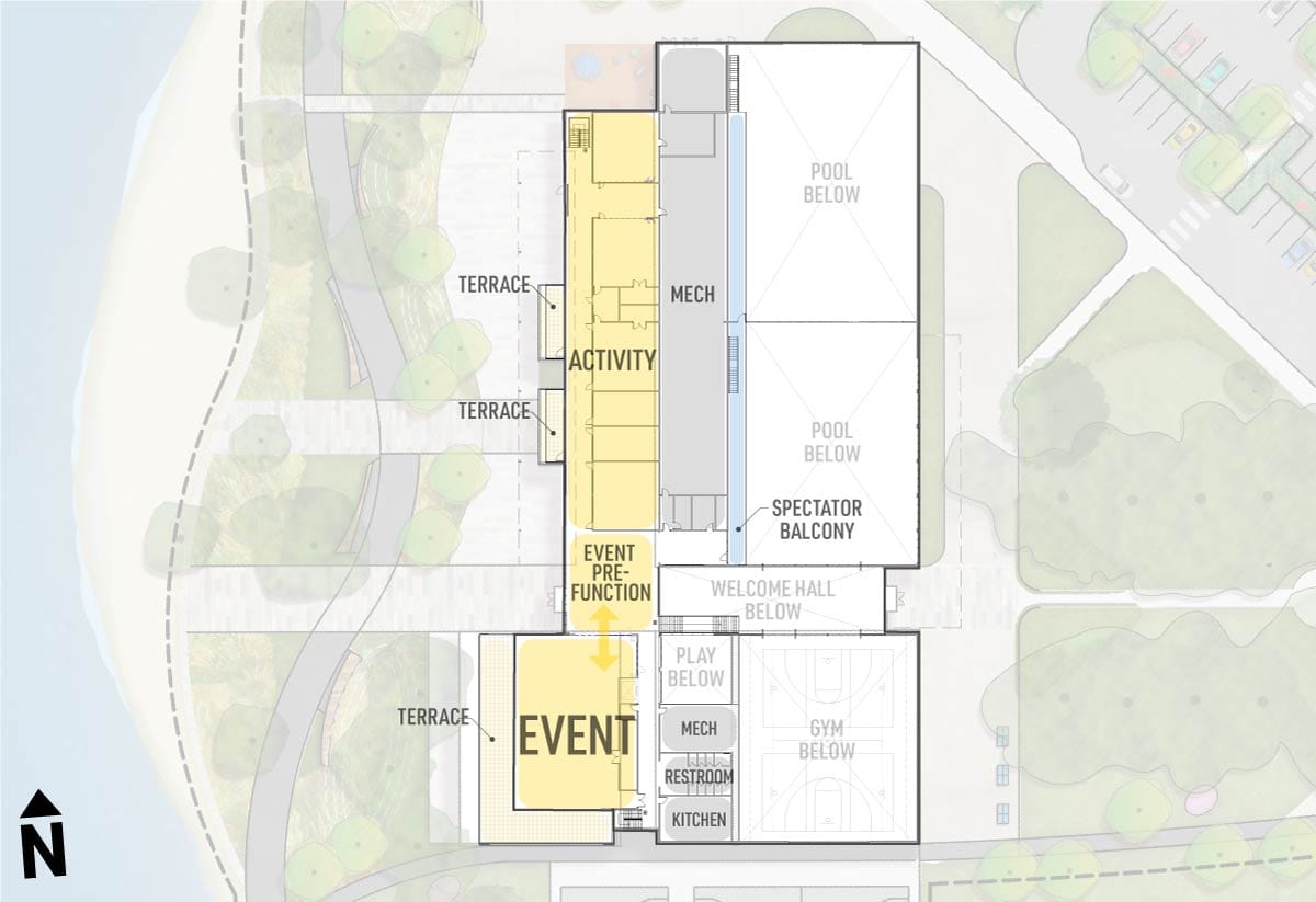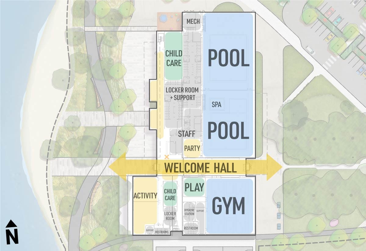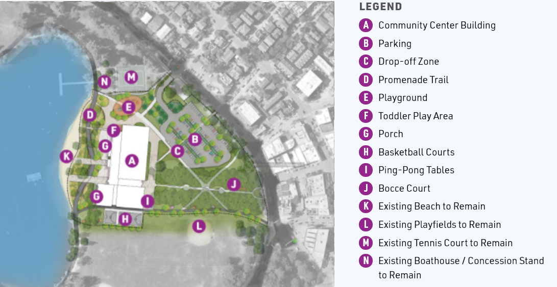 In terms of actual building design, the preliminary plans pull from the “lakeside porch” theme (Option 2) and “terraces” theme (Option 1) presented in the August open house. If implemented, the blended design could wind up giving visitors excellent views and access to the lake. The second floor will have the terraces that look out to the lake, and the west side of the building will have multiple exits that spill out onto the porch, trail, and lake. The east side of the building incorporates an intuitive alignment of the entrance with the avenue.Entering the building from the east, visitors are met with a welcome hall that gives visitors the opinions to navigate to the center’s amenities, find a space to sit and relax, or proceed through the community center and to the beach. The new community center will host two pools, a gym, child care, event space, and a variety of other services for patrons and the surrounding community. Access to the terraces, the pools’ spectator balcony, and additional activity and event space can be found upstairs in the presented design.Survey Focus