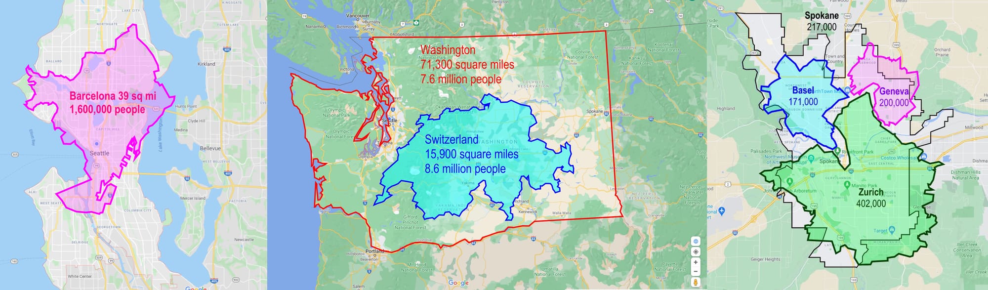 The prevalence of single-family zoning is a policy failure that has led to families being priced out and having to travel further to get to jobs and school, mostly by car. What these GMA updates can do is guide our city planning departments to realize how much space we really have for housing growth. For scale, the country of Switzerland is a quarter of the land size of Washington and has a million more people in it. The largest Swiss cities (Geneva, Basel, and Zurich) could all fit within Spokane with 20 square miles to spare. Seattle’s 84 square miles are large enough to fit all of Paris and Barcelona. Manhattan houses 2.2 million people on one quarter of the land Seattle has.