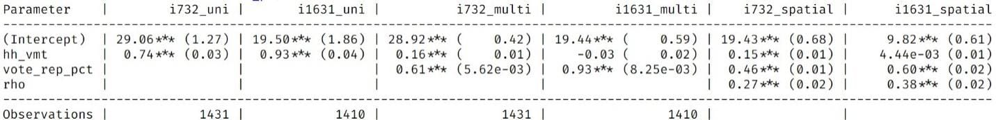 For I-1632, that initial influence on voting patterns was even higher, with an added 0.93% for the “no” vote for every mile driven. Interestingly, the relationship with partisanship was very different between the two initiatives. For I-732, even when adjusting for partisanship, each mile still increased the percentage vote against the initiative by 0.15% and was very statistically significant. For I-1632, in contrast, once partisanship was included, the relationship to VMT went essentially to zero and was no longer significant.