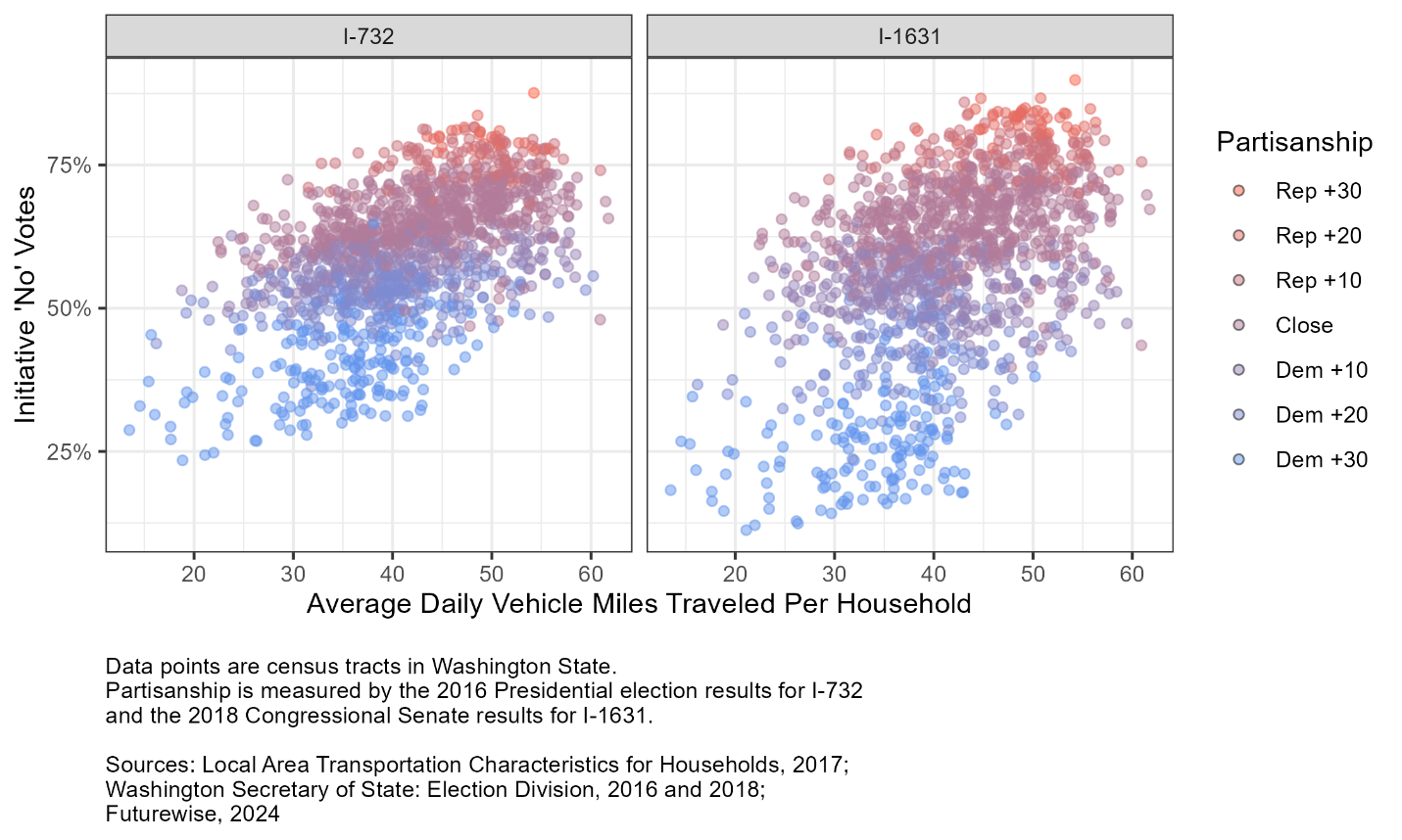 One possible explanation relates to the specific policy design and politics of the two initiatives. I-732 proposed a market-based system with a focus on reducing other taxes. While Democratic voters are more generally supportive of climate initiatives, this structure may have appealed more to Republicans and less to Democrats. This may have led voters to focus more on the personal pocketbook impacts and less on the partisan associations of climate change. I-1631 was designed with an environmental justice focus on increasing government investment to address the needs of frontline communities from both the initiative’s pricing policy and climate change itself. This may have earned support from traditional Democratic constituencies, even in neighborhoods that are very dependent on driving, while turning off more Republicans.