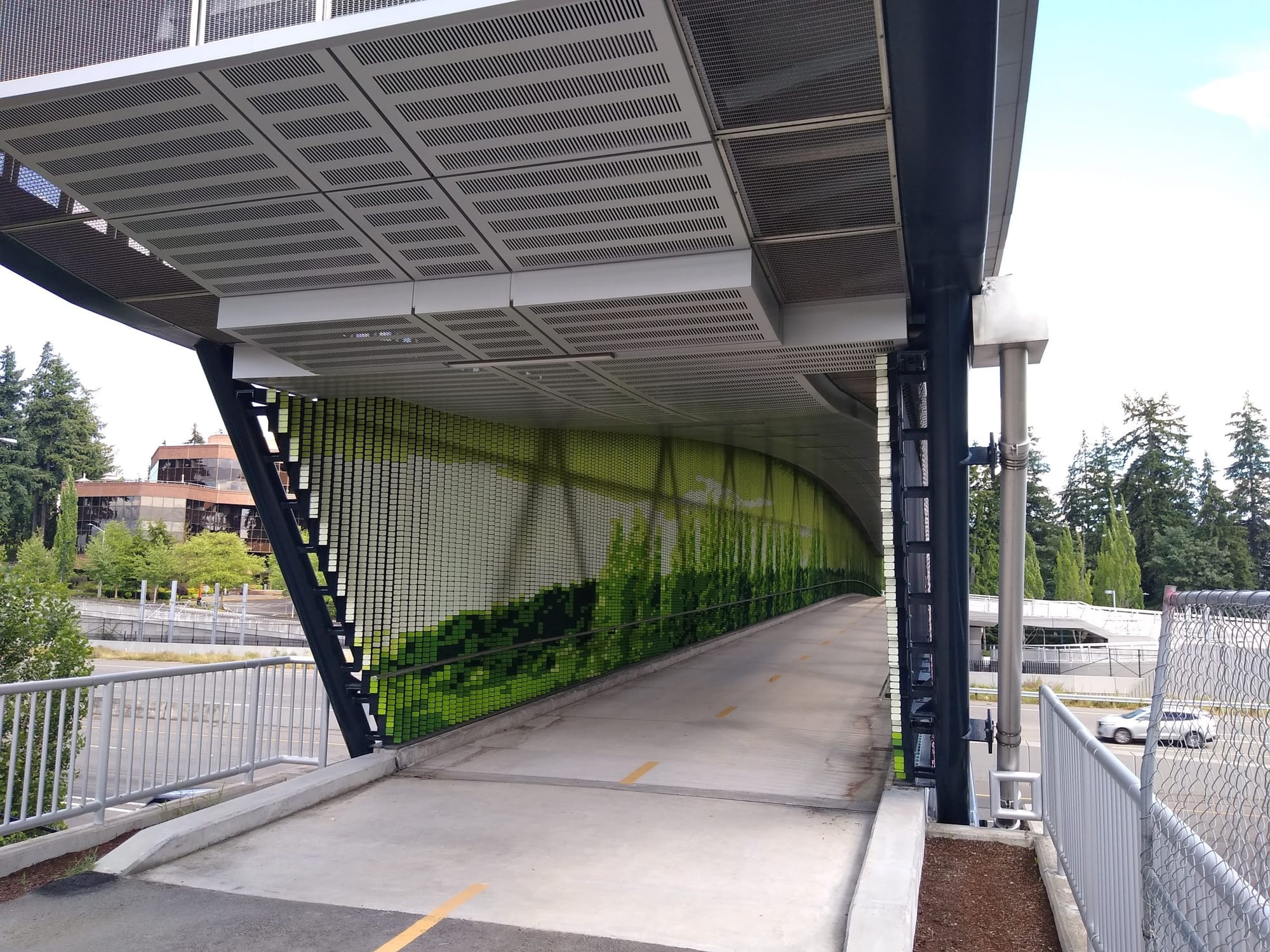 The first bridge, which is opening later this summer, connects to the Overlake Village light rail station, providing a new connection where one didn’t exist between 148th Avenue NE and NE 36th Street, directly at the bus stops serving Overlake Village Station on 152nd Avenue NE. For the bridge’s interior, Sound Transit commissioned work from Seattle artist, Leo Berk, which is made of more than 156,000 hand-painted tiles creating a natural image intended to evoke the early computer age, a nod to Microsoft, whose sprawling 500-acre headquarters is in the Overlake neighborhood.