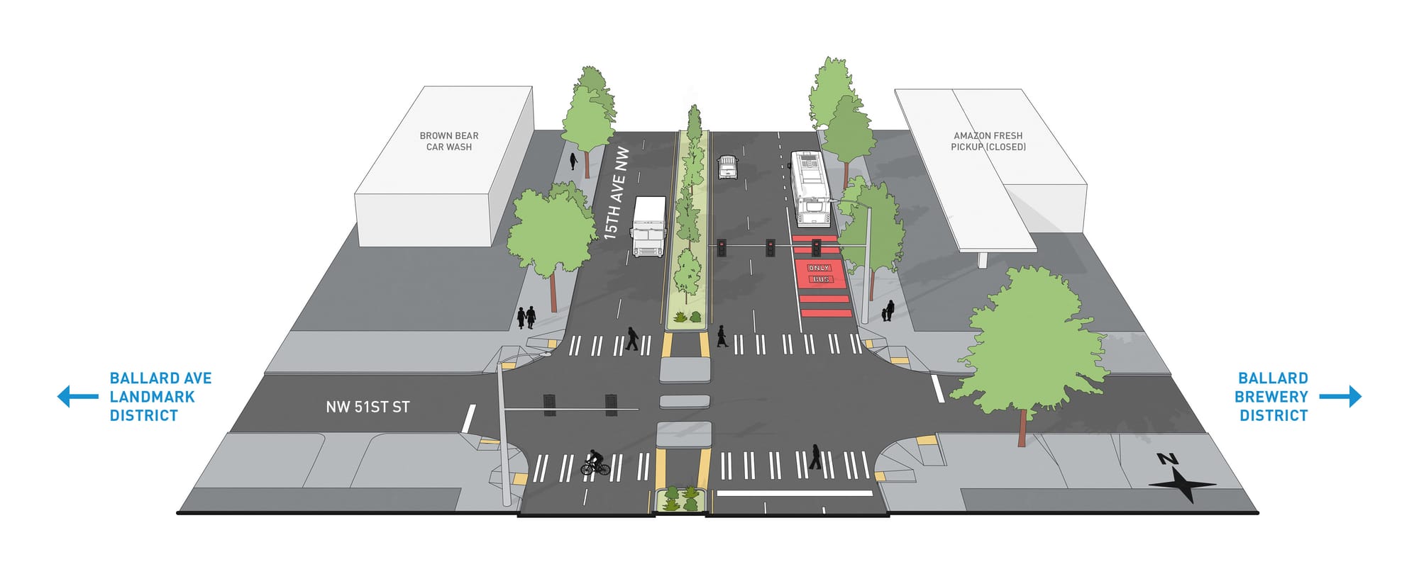 The new design elements will make 15th Avenue NW safer for pedestrians, bicyclists, and drivers and will reconnect communities and businesses in East and West Ballard, making our neighborhood even more welcoming to people of all ages and abilities.”
