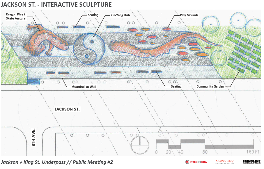 The focus is on the two embankments where I-5 meets ground level to the north and south, as the parking lot in the middle must remain in use. Above is one iteration of the many ideas that came out of the two design charrettes that have been held so far. Public art, dog parks, seating areas, and play features are among many of the possibilities. The image below shows one opportunity for enhancing the underside of the freeway structures.