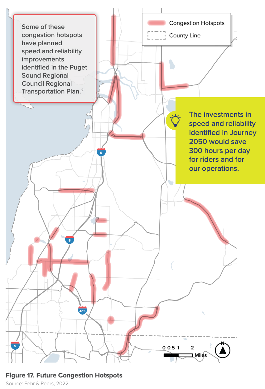 To support transit service in the decades ahead, Community Transit intends to establish a speed and reliability team to monitor specific congestion hotspots in Snohomish County. Those hotspots include numerous highway sections like US-2, SR 99, SR 527, and SR 529 as well as key streets like 164th Street SW and 35th Avenue SE. The speed and reliability team will also be responsible for coordinating with local and state partners to develop improvements for transit.