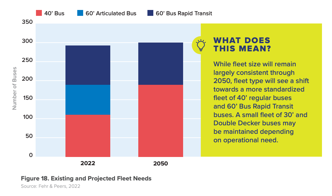 In the coming years, the plan directs Community Transit to adjust its bus fleet makeup, largely by phasing out 60-foot articulated buses on non-BRT routes. The overall fleet would slightly increase, but mostly by replacing 60-foot articulated buses with 40-foot buses. This reflects the agency’s desire to focus on local bus service and expansion of Swift. As a result, the number of 60-foot articulated buses would increase a little to support expansion of the BRT services. Community Transit may also continue to invest in a small fleet of 30-foot double-deckers for specific service needs.