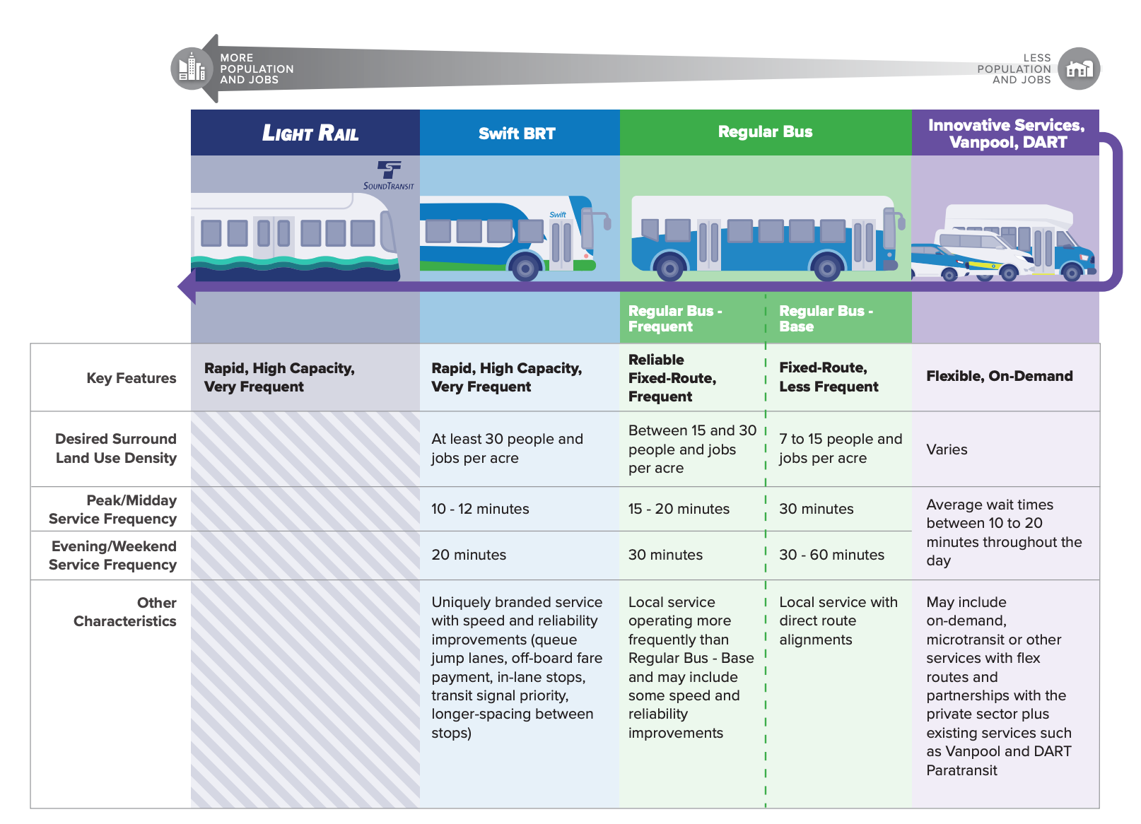 As Community Transit evolves, the long-range plan to 2050 calls for significant changes to the fixed-route system, with a priority around regular bus service and BRT. It also emphasizes the need to plan for and support flexible services. This by extension means fully phasing out express commuter bus routes.