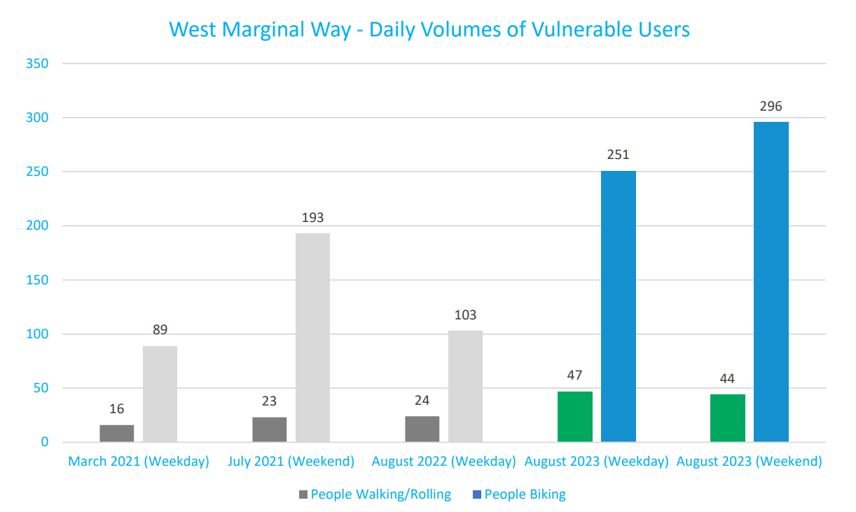 The number of people biking along West Marginal Way on weekdays this past fall was up 144% over 2022 numbers, with weekend ridership up 53%. The number of people walking increased by 96% on weekdays and 91% on weekends. While the absolute numbers of people walking, biking, and rolling on industrial West Marginal remain relatively low compared to other high-use facilities elsewhere in the city, the significant boost in usage that was seen after implementing relatively low impact changes shows how space can be reallocated, even on major truck streets, for the benefit of all street users.