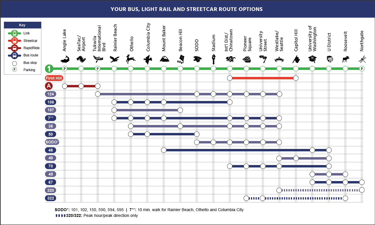 David Lawson, a former Seattle Transit Blog reporter, suggested some transit alternatives on Twitter, such as the Route 7 between the Rainier Valley and Downtown Seattle and Route 124 between Tukwila International Boulevard Station and Downtown Seattle.
