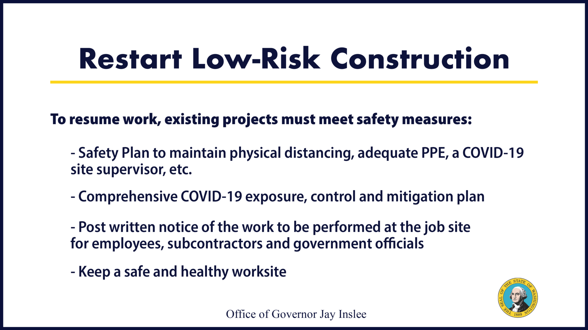 The 30 health and safety requirements were developed as part of a collaborative effort between the Governor’s Office, Washington State Department of Commerce, other relevant state agencies, and industry representatives. Many industry leaders praised this effort during the governor’s press conference last week, urging all builders to tightly follow the requirements to keep industry open.