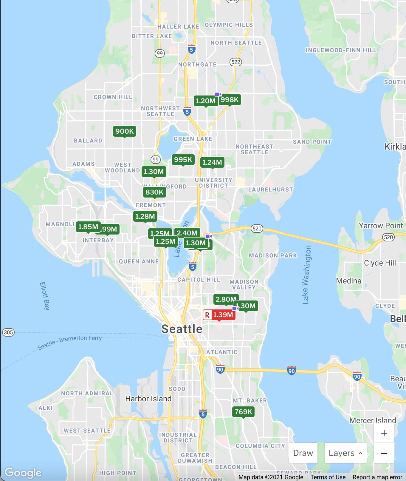 The median home price in Seattle for May 2021 was $818,750. Of the 1,368 homes sold in Seattle during that one month, 684 of them went for more than $818,000, and 684 sold for less. That figure is $42,000 or 5% more than the absolute limit for conventional conforming single-family loans. Our housing market is bonkers.