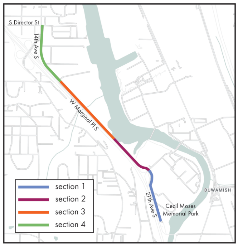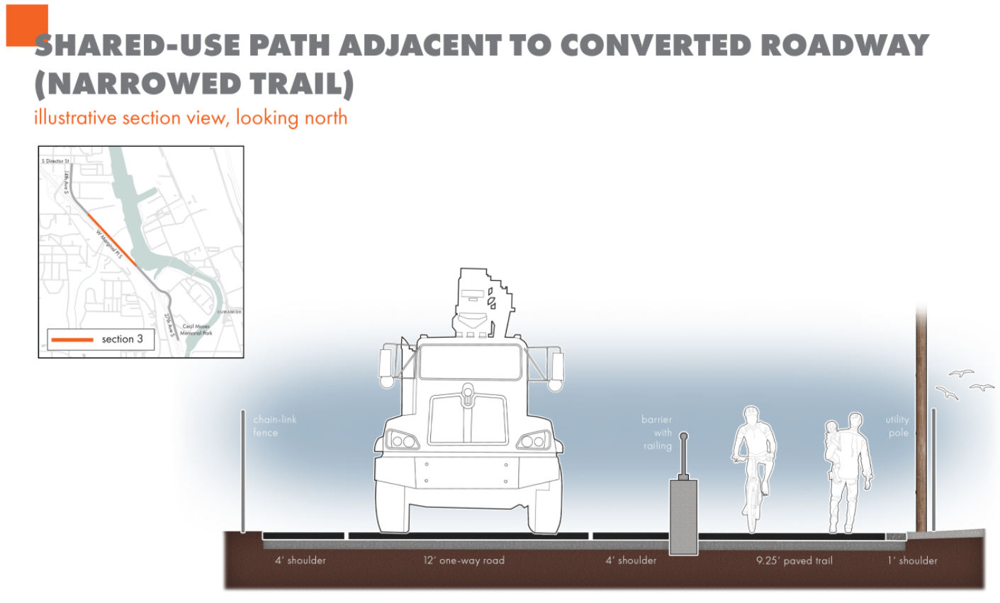 The trail will mostly run alongside West Marginal Place S, a two-lane frontage road to State Route 99 that trail users currently have to brave if they want to get onto the Green River Trail from Seattle’s South Park neighborhood. The existing roadway has minimal shoulders on either side, and walking to the trail requires sharing the road with freight traffic accessing the neighboring businesses. As part of this project, King County will also be widening a segment of the existing Green River Trail north of Cecil Moses Memorial Park in Tukwila.