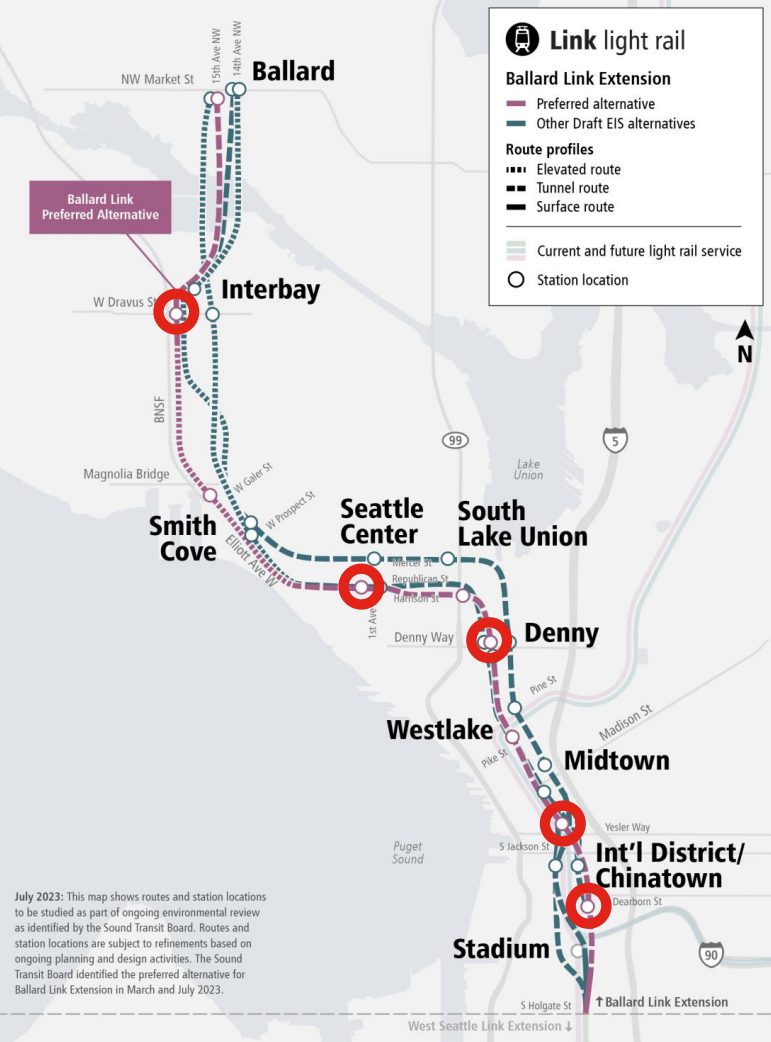 Delays in advancing Ballard Link through the NEPA process can't entirely be blamed on FTA. A Sound Transit status report from early 2024 actually eyed publication of a DEIS later that year, during the Biden administration. But the report noted that additional station alternatives that were added into the mix in 2023 were creating a significant risk of additional delays. That was also the first time the board officially selected a preferred alignment β seven years after voters approved the Sound Transit 3 (ST3) package in 2016.