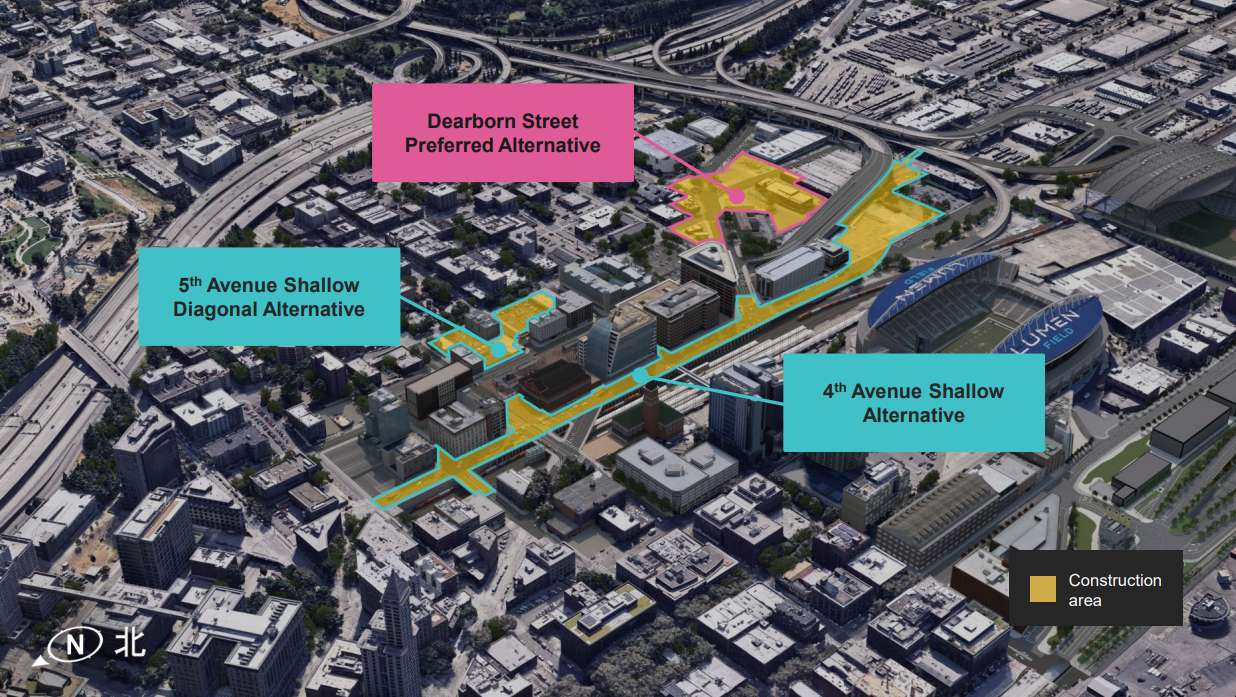 Those additional options up and down the 7.7-mile corridor included adjustments at Interbay, Seattle Center, Denny as well as the high-profile decision to pivot away from a new Chinatown-International District station at the existing Jackson Street transit hub. Instead, in a move proposed by former Mayor Bruce Harrell and former King County Executive Dow Constantine (now overseeing the project as Sound Transit CEO), the board selected a new "north-south" alternative that would include stations near S Dearborn Street and close to the existing Pioneer Square Station next door to King County's sizable property holdings in the area.