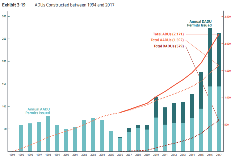 The DEIS provided some important statistics showing how the different alternatives would perform in the years ahead. Alternatives 2 and 3–the action alternatives–would each add extra ADUs, both attached and detached–over the status quo. The city projects Alternative 1 would result in 1,890 new ADUs through 2027 while the reforms in Alternatives 2 and 3 would net an additional 1,200 to 1,400 ADUs beyond the status quo. Alternative 2 would produce the most ADUs with its 3,330 slightly outperforming Alternative 3’s projected 3,100 total, according to the DEIS.