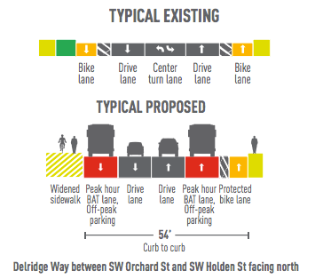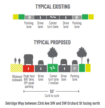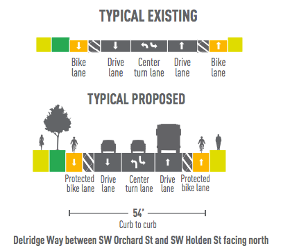 The second option would convert the current southbound unprotected bike lane on Delridge into a protected bike lane. The only northbound bike facility would remain the stretch of PBL that is currently in place between Orchard and Holden.