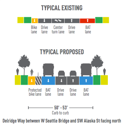 Both options include bus-only lanes for the entire way from the West Seattle Bridge to SW Alaska St. Currently there is only a business access and transit (BAT) lane in the northbound direction–a lane would be added southbound as well. From there the two options differ, in a tradeoff that is becoming all-too-familiar to transit advocates.