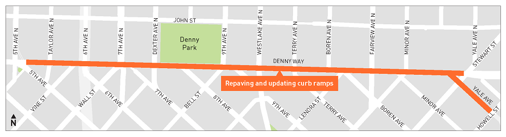 As soon as next year, the Seattle Department of Transportation (SDOT) will start construction on a major repaving project along one of the city’s most congested streets, Denny Way. The pavement maintenance project will target the street’s busiest segments, starting just east of 5th Avenue N extending all the way to I-5’s front door at Stewart Street and including a short stretch of Yale Avenue which drivers use to get onto the highway. The $5.05 million project, one of the last major corridor repavings planned under the Move Seattle Levy set to expire next year, will also repair some sidewalks, rebuild substandard curb ramps, and make some other minor street changes intended to improve safety.
