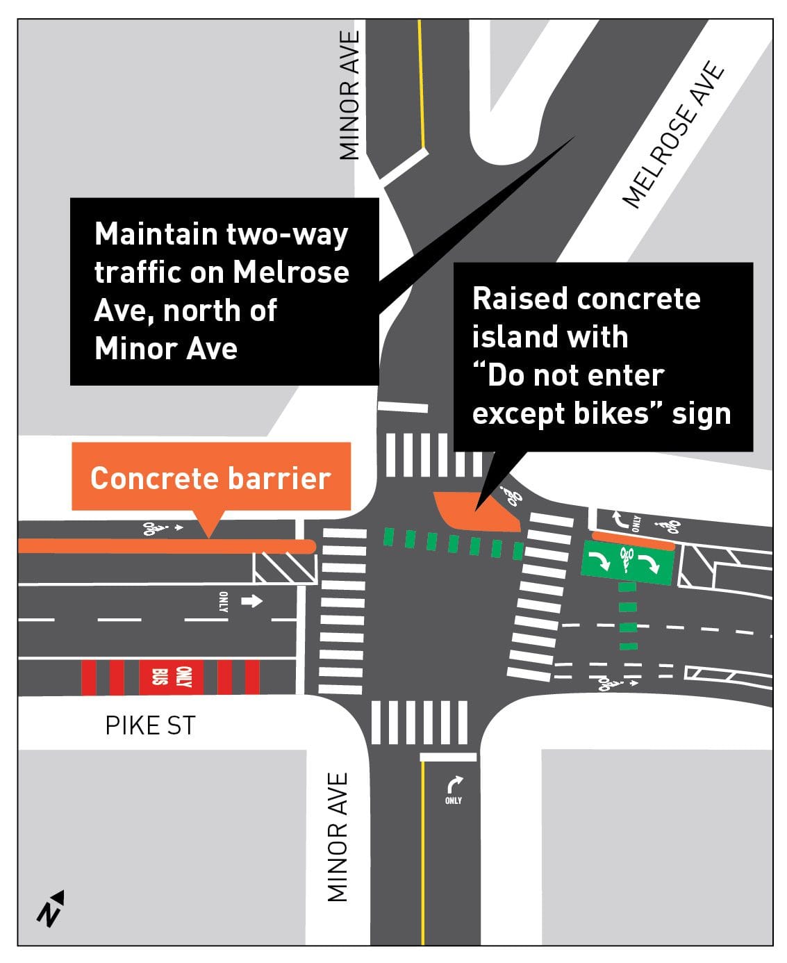 In addition to bollards, the department also announced that it would be adding additional restrictions on how drivers can access the intersection: it’s already illegal to turn left from Pike Street onto Melrose, after these changes it will no longer be legal to drive straight across Pike from Minor Avenue either, and a new concrete island will make it more clear that these movements are prohibited. The concrete island was already planned as part of the bike lane being installed on Pike Street, but these new signs laying out access restrictions were not part of those plans.