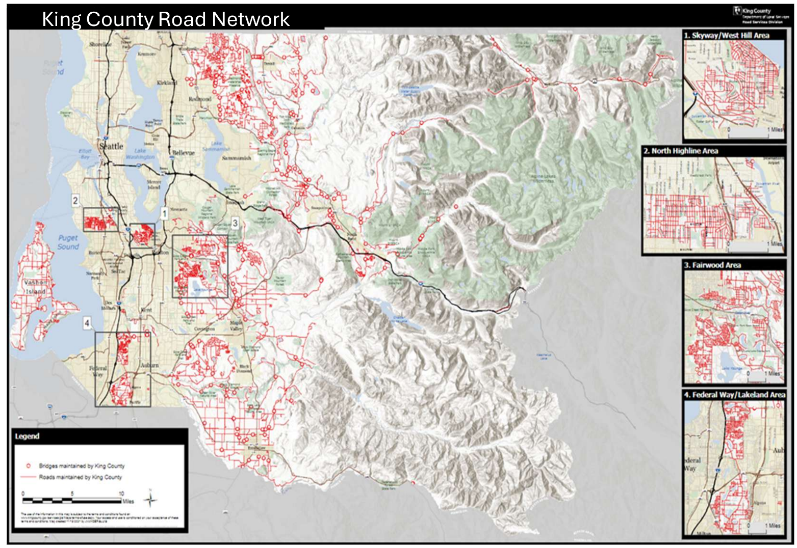 King County's roads network stretches around 1,500 miles, primarily across the eastern portion of the county but also in areas like White Center, Skyway, Fairwood, and the entirety of Vashon Island. The County also controls 193 bridges, with around half of those bridges aged past their expected useful lifespan.