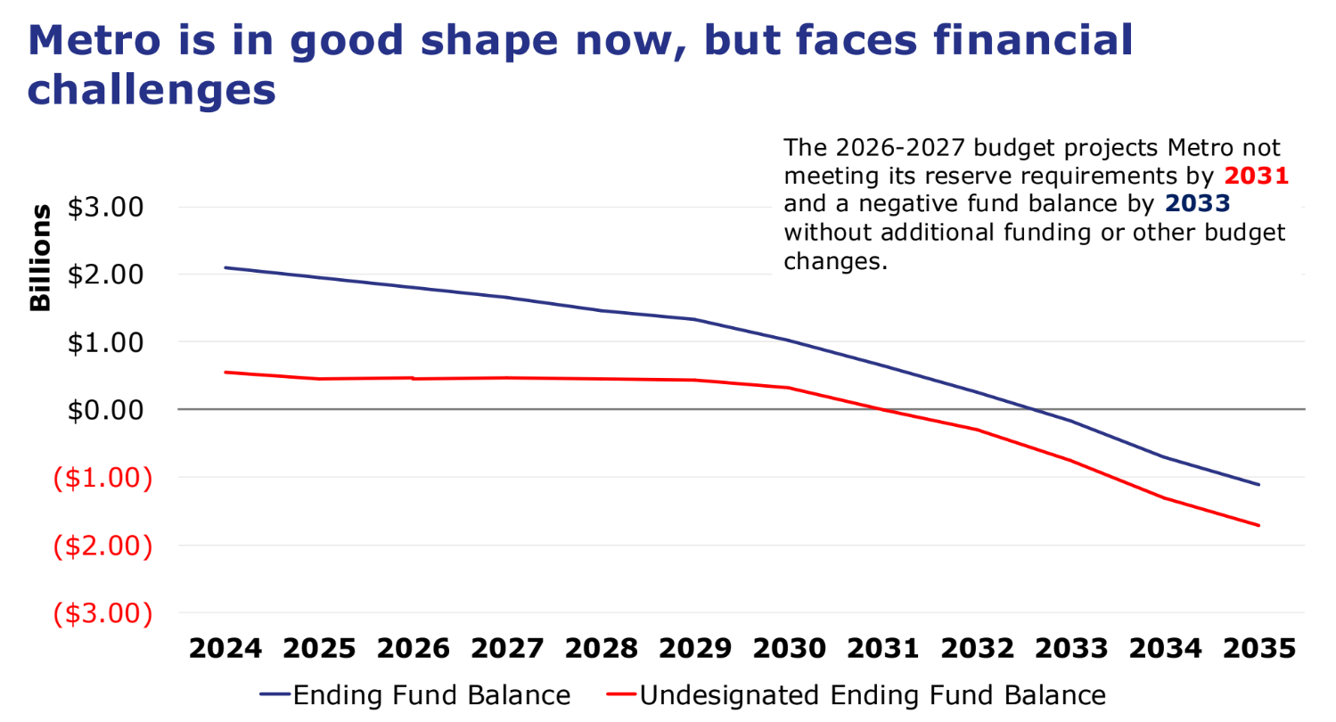 If implemented by 2030, as included in the current version of SB 6346, that repeal would balloon Metro's projected deficit through 2035 from $1.75 billion to $2.1 billion, or around $70 million per year. An amendment on deck in the House this week to align the bill with Governor Bob Ferguson's priorities would move that back to 2029, increasing its impact on Metro.