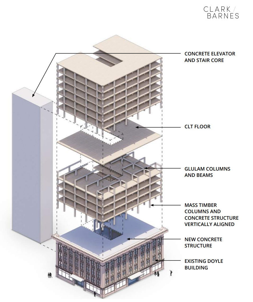 Clark/Barnes architects are working with the owners of the Doyle Building, a four-story landmarked building dating from 1920, and are looking to give the building a big upgrade that addresses the realities of high vacancy levels in downtown offices. Their proposal would take advantage of a suite of newly approved state and city policies approved with the express purpose of making it easier to build housing.