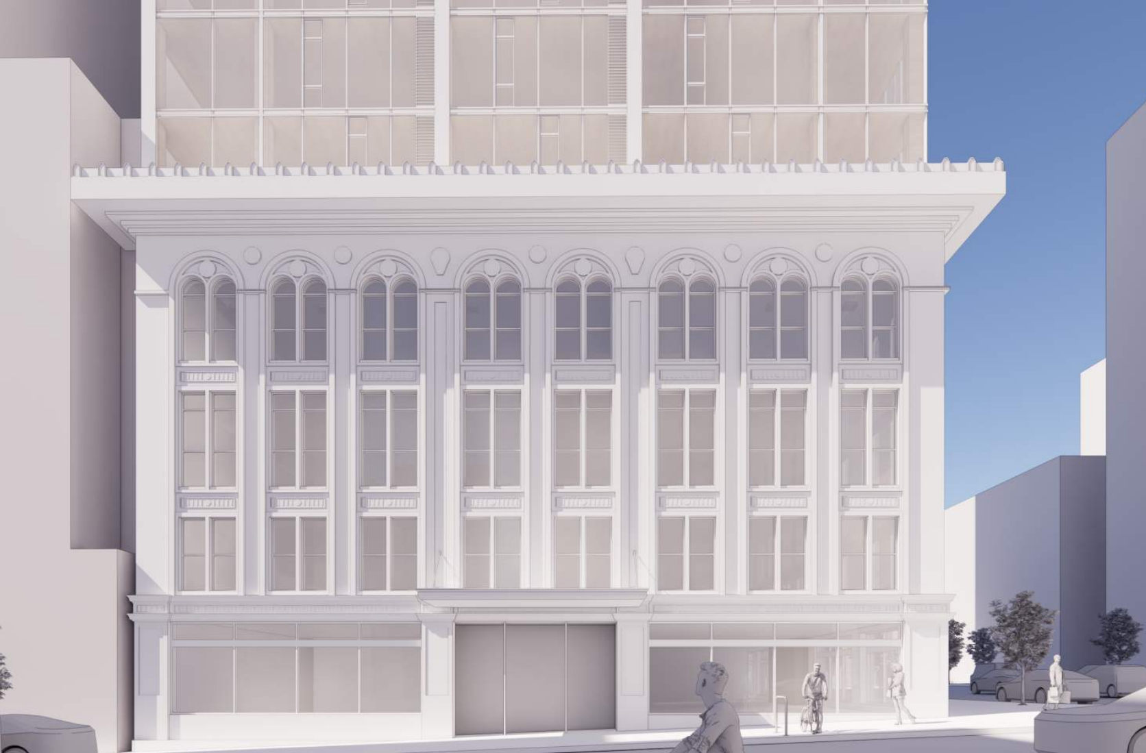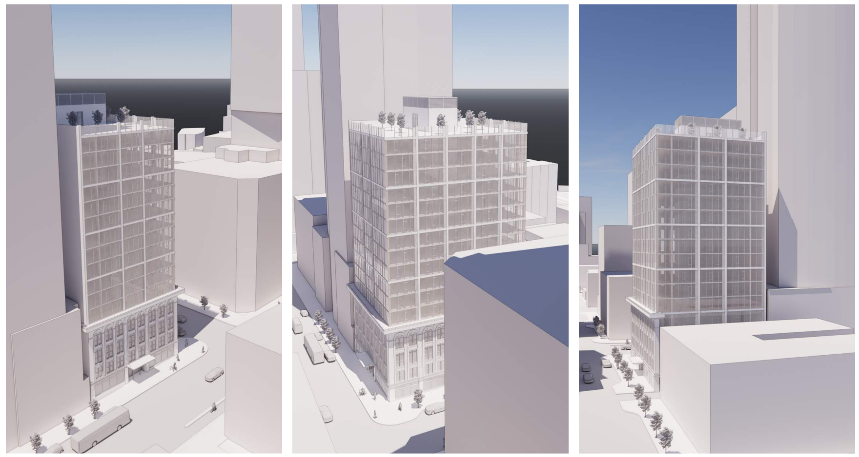 Architects propose retaining the facade of the existing structure and adding 12 additional floors of new construction on top. That new addition would consist of mass timber, allowing a smaller foundation and less weight on the historic building below.