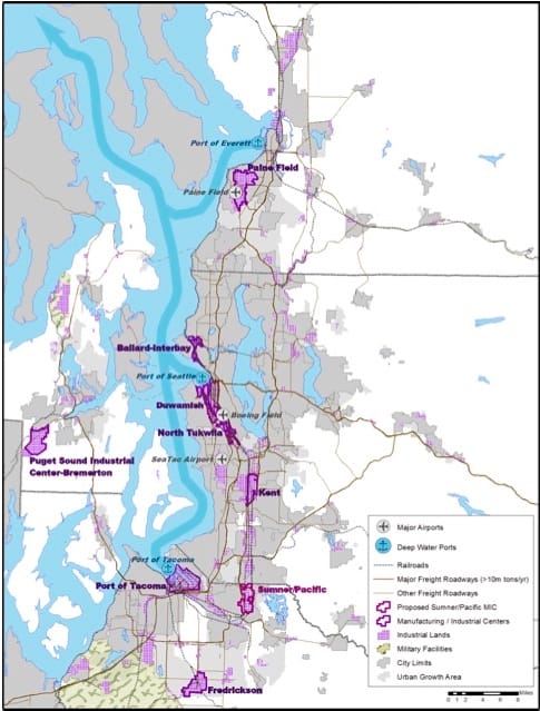 Admittedly, our city lines do strange things to our economic development. In Vision 2050, the Puget Sound Regional Council identifies a dozen growth centers and manufacturing centers and draws them as distinct dots on the map of the four regional counties. But when we pull back to look at the real space those dots cover, we can see the continuous line of industrial areas from Ballard-Interbay to Sumner/Pacific through the Duwamish, Tukwila, and Kent. Industrial Seattle covers ten jurisdictions and sections of two counties already. Adding another county boundary would surely improve some of that industrial loss.