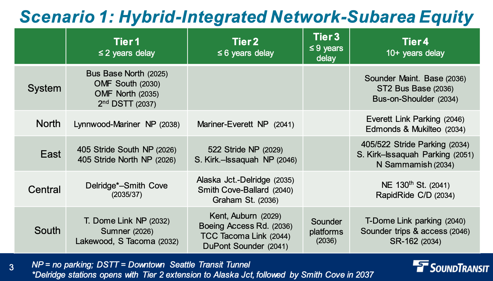 The first scenario highlighted by staff focused on a hybrid of an integrated network and subarea equity. Light rail projects would generally be completed in the first two tiers with delays of two or fewer years in the first tier and six or fewer years in the second tier. Key light rail projects in the first tier include Tacoma Dome Link (2032), Delridge-Smith Cove Link (2035/2037), the second Downtown Seattle Transit Tunnel (2037), and Lynnwood-Mariner Link (2038). That tier would also see the completion of I-405 Stride bus rapid transit in 2026. For the second tier, the remaining light rail extension and bus rapid transit projects would wrap up with SR-522 Stride (2029), Alaska Junction-Delridge Link (2035), Smith Cove-Ballard Link (2040), Mariner-Everett Link (2041), Tacoma Community College-Tacoma Link (2044) and South Kirkland-Issaquah Link (2046). Seattle infill stations would be kicked back to 2036 for Graham Street and Boeing Access Road and to 2041 for NE 130th St.