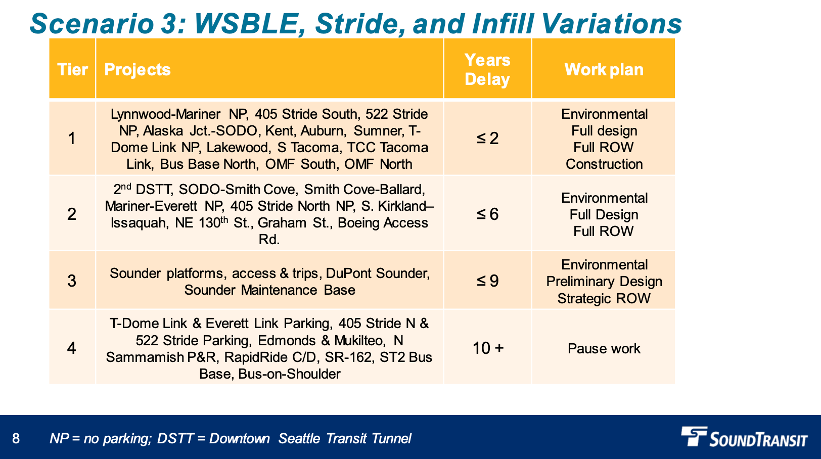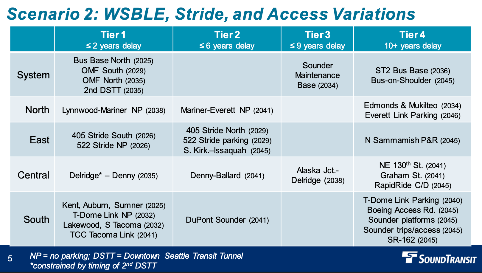 The second scenario presented centered the progression of West Seattle and Ballard Link extensions with access project variations. The first two tiers have the same level of years of delay as the first scenario. Key light rail projects in the first tier include Tacoma Dome Link (2032), Delridge-Denny Link (2035), the second Downtown Seattle Transit Tunnel (2035), Lynnwood-Mariner Link (2038), and Tacoma Community College-Tacoma Link (2041). That tier would also see the completion of I-405 and SR-522 Stride bus rapid transit in 2026. For the second tier, additional light rail extension projects would advance with Denny-Ballard Link (2041), Mariner-Everett Link (2041), and South Kirkland-Issaquah Link (2045). The light rail projects would wrap up in the third and fourth tiers with Alaska Junction-Delridge Link in 2038 and Seattle infill stations (Graham Street and NE 130th St in 2041 and Boeing Access Road in 2041).