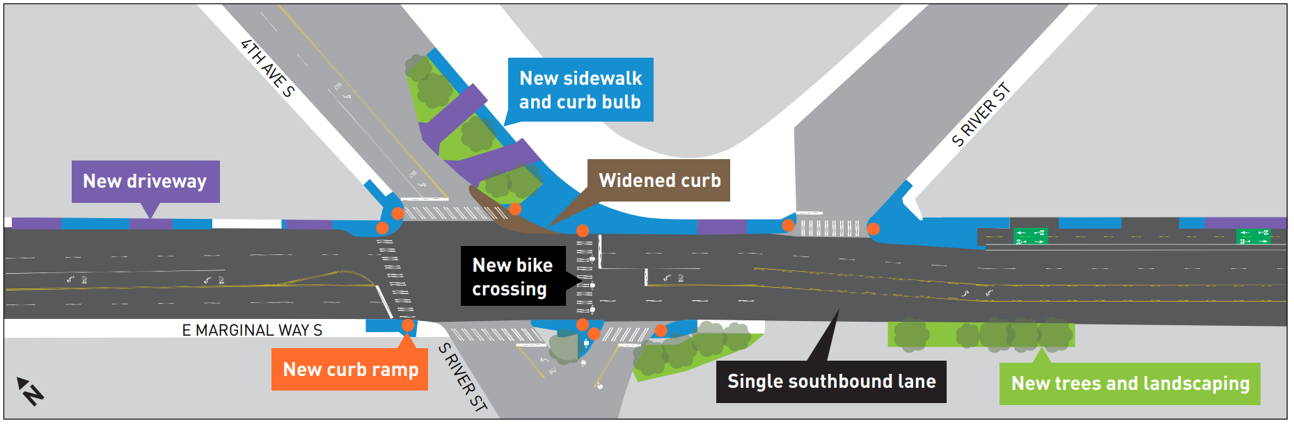 North of Corson, a new two-way protected bike lane would connect to S River Street, where people on bikes could use a new bike crossing to head to and from the First Avenue S bridge. The project would also fully close a slip lane from Marginal onto Fourth Avenue S, improving safety for everyone walking, rolling, or biking in this area.