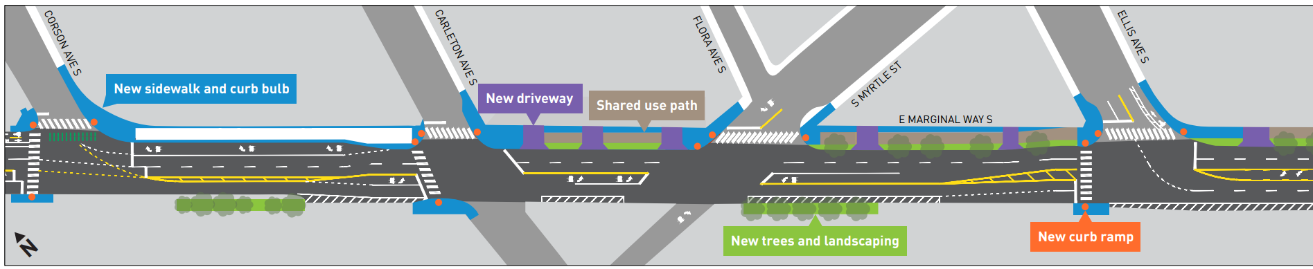 With E Marginal Way so overbuilt, SDOT proposes to make space for people who walk and bike along the street’s east side by repurposing a traffic lane for most of the corridor. South of Corson Avenue S, a new shared-use path along the east side of the street would create a new spur for Georgetown to South Park Trail, providing connections into additional parts of Georgetown, including the Healthy Street on Flora and Carleton Avenues. The project would also replace and upgraded curb bulbs at Carleton and Corson Avenues, reducing crossing distances for people walking.