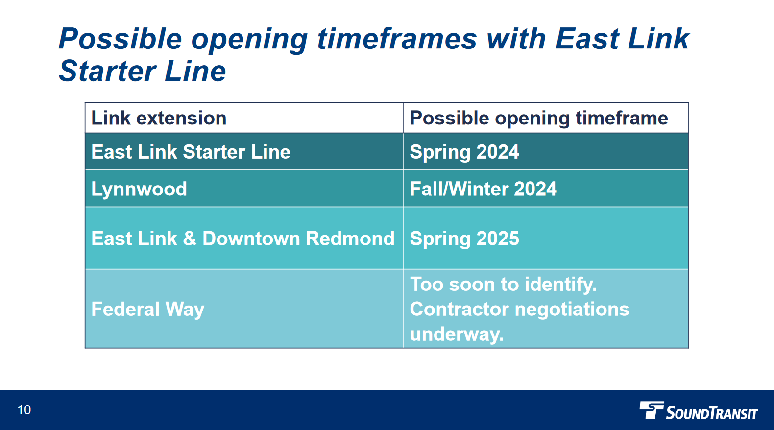 - A partial East Link line (South Bellevue Park and Ride to Redmond Technology Station) could open in Spring 2024.