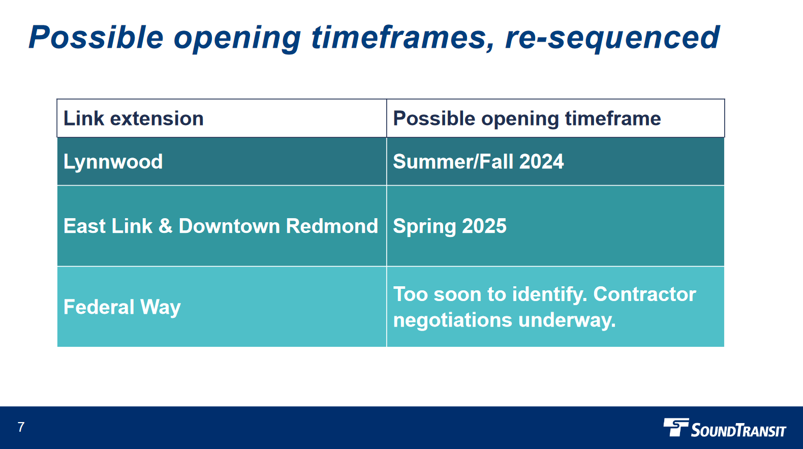 - Downtown Redmond Link (Marymoor Village and Downtown Redmond stations) would be delayed from late 2024 to open simultaneously with East Link in Spring 2025.