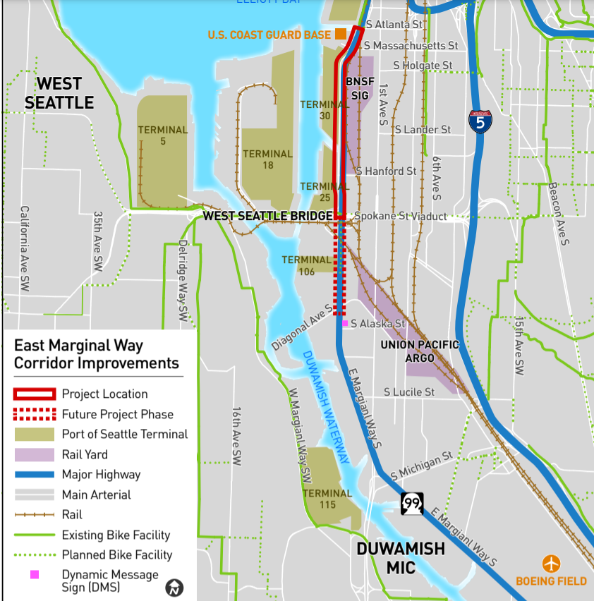 The signals along the corridor will also be upgraded to become adaptive signals, a system that has caused significant negative impacts to pedestrian experience after being installed in Seattle’s center city but which may be more appropriate for the context of a freight corridor with little cross traffic like East Marginal Way.