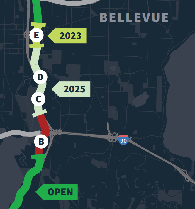 But to the south in Bellevue, the next major segment of Eastrail that was set to open this fall, a new bridge over NE 8th Street that will directly connect to Sound Transit’s Wilburton light rail station, has been delayed by supply chain issues. When open, that bridge will unlock the next segment of trail south of the Spring District down to NE 4th Street in addition to getting riders over the busy NE 8th Street. A delay to the bridge’s opening puts the project in line with the rest of the East Link light rail project, originally set to start service this year but pushed to at least early 2024 as a “starter line” that wouldn’t cross I-90 into Seattle.