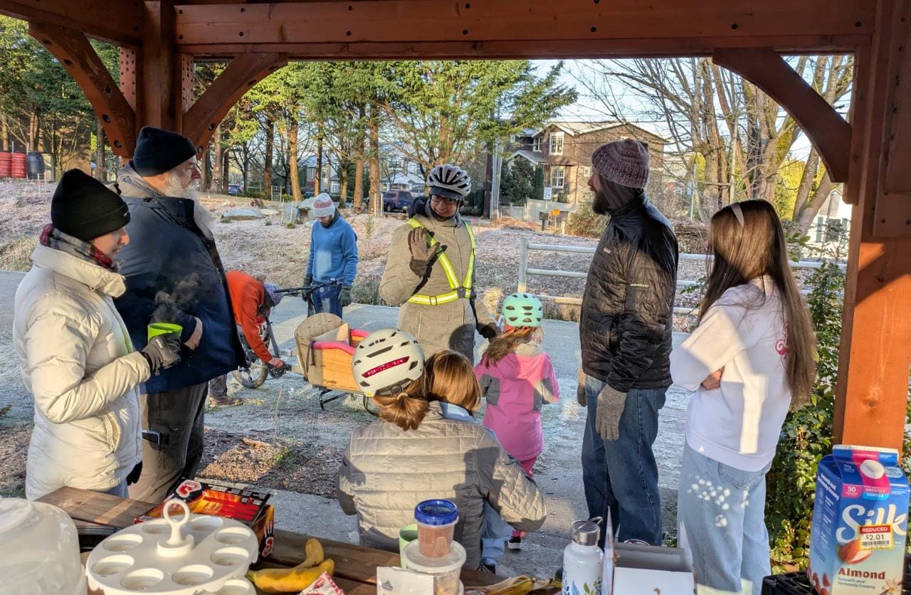 “Coffee Outside is such a part of our week that I honestly don’t remember how and when we started going,” says Ashley Knapp, a resident of Kirkland’s Norkirk neighborhood. “I bike my daughter to school everyday and we look forward to Wednesday mornings every week. I’ve enjoyed getting to know people I see on the trail. I get to talk shop about bikes and learn about what’s happening locally, where change feels most possible. I now feel like I’m part of a community, not just living here. My daughter, of course, mostly just loves the homemade muffins and hot chocolate.”