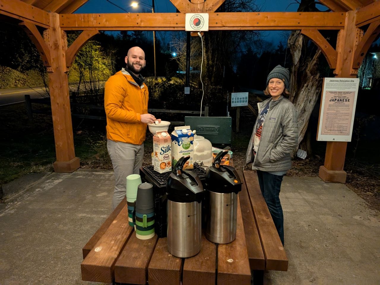 It’s a foggy, dark morning, and I see someone approaching with a headlamp. As they get closer I recognize the silhouette of Dylan Hanson, a resident of my neighborhood I met months before on a (warmer) Wednesday morning, under this very shelter. He’s carrying a carafe.