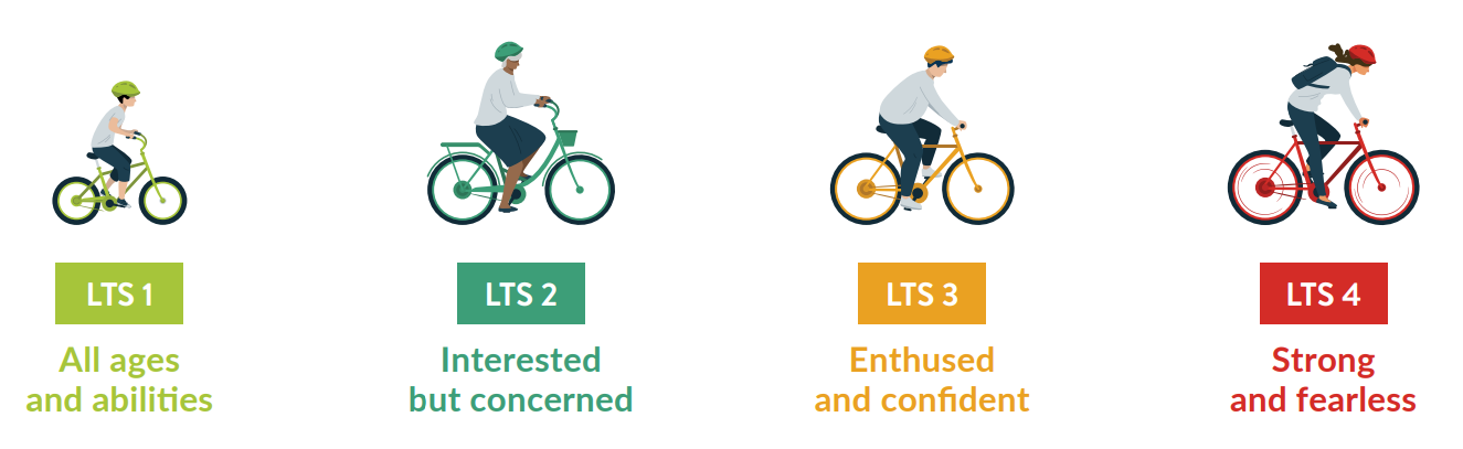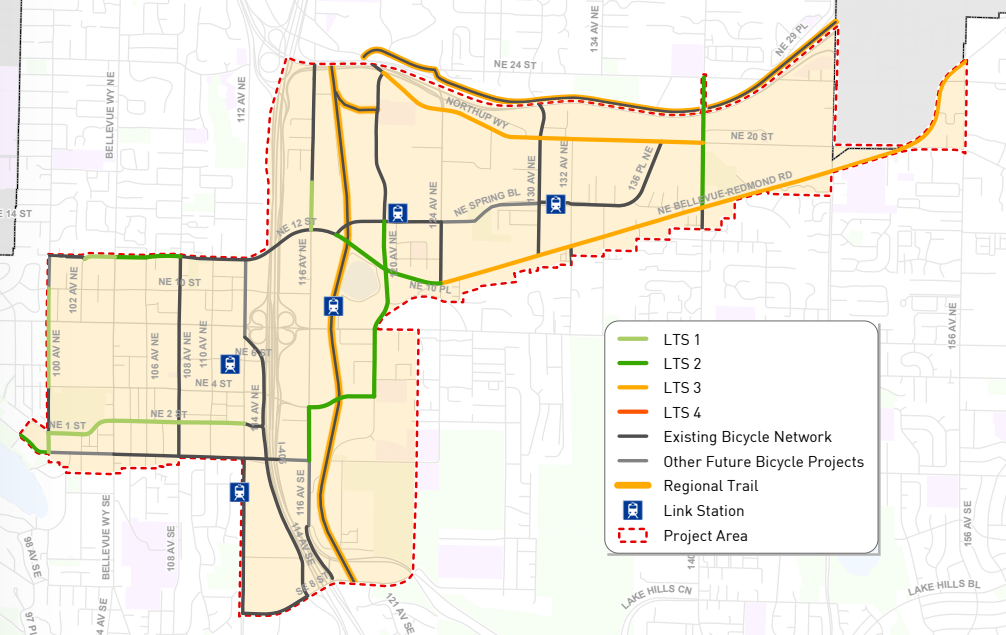 Using a “level of traffic stress” metric, Bellevue determined which streets to upgrade based on current conditions for people biking and the potential to create a fully connected network in these three neighborhoods. A majority of the bike facilities that exist are a level of traffic stress 4, meaning only people biking who are most comfortable sharing street space with fast-moving cars are able to use them, with around one-third of the miles in place a level of stress 3, accessible to slightly less bold users.