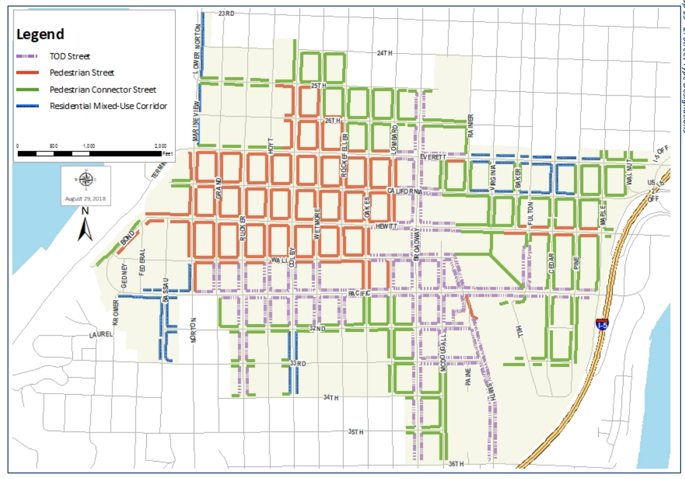 - Street classifictions. Blockfaces throughout much of Metro Everett have been given street classifications. The purpose of the classification system is to ensure that development is compatible with a street type. For instance, building setbacks, overhead weather protection, building transparency, allowed uses, and street design are predicated on the street classification of a blockface. There are four street classification types with Transit-Oriented Development (TOD) Streets being the most active type. TOD Streets encourage high building transparency, uses that generate foot traffic, and limit parking visibility.