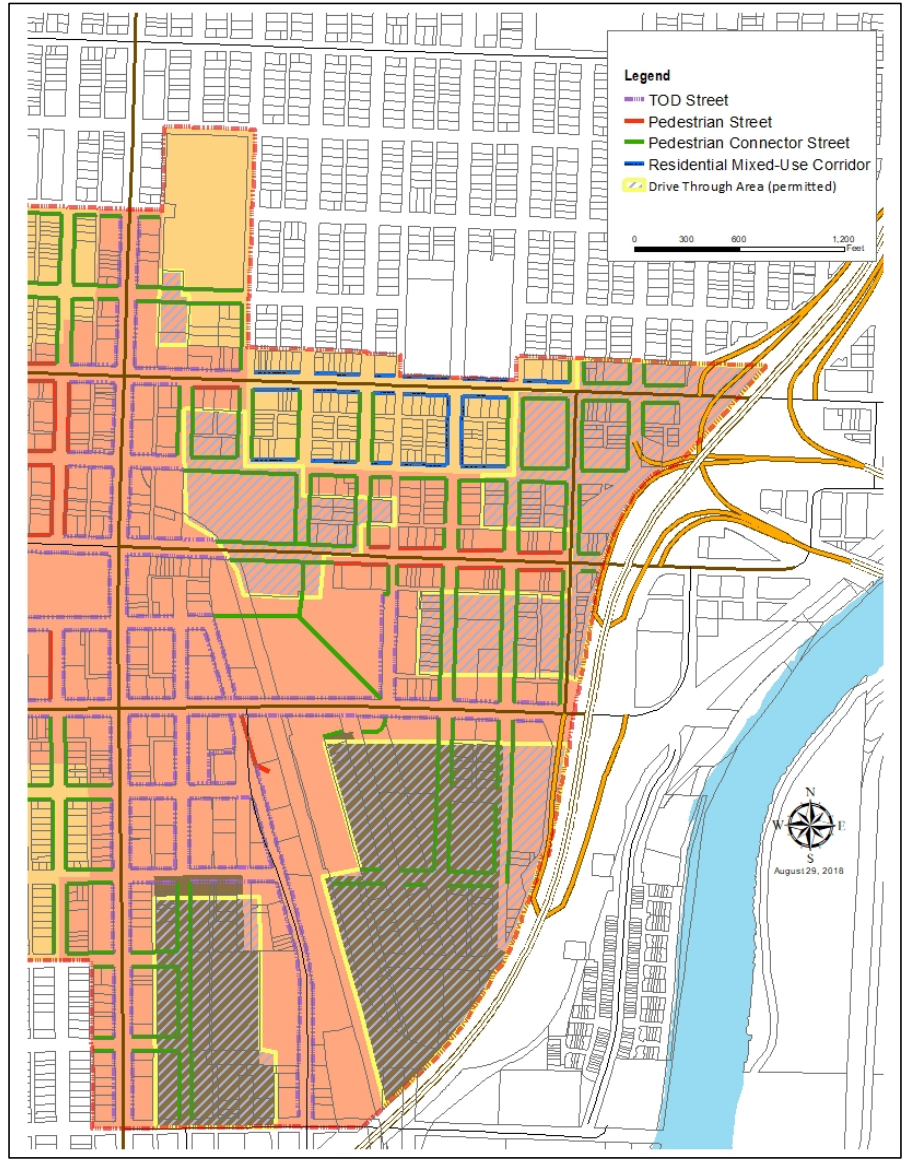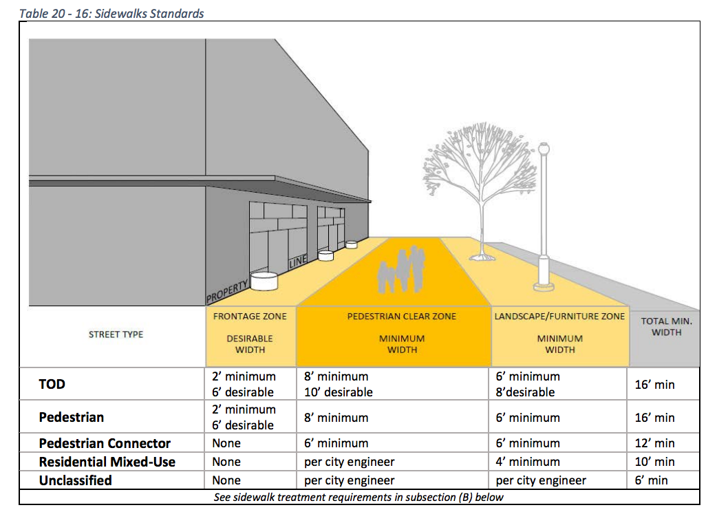 - Street improvement standards. New development will need to improve streetscape frontages based upon blockface classification. TOD Streets command the widest pedestrian zones and planter/furniture strips.