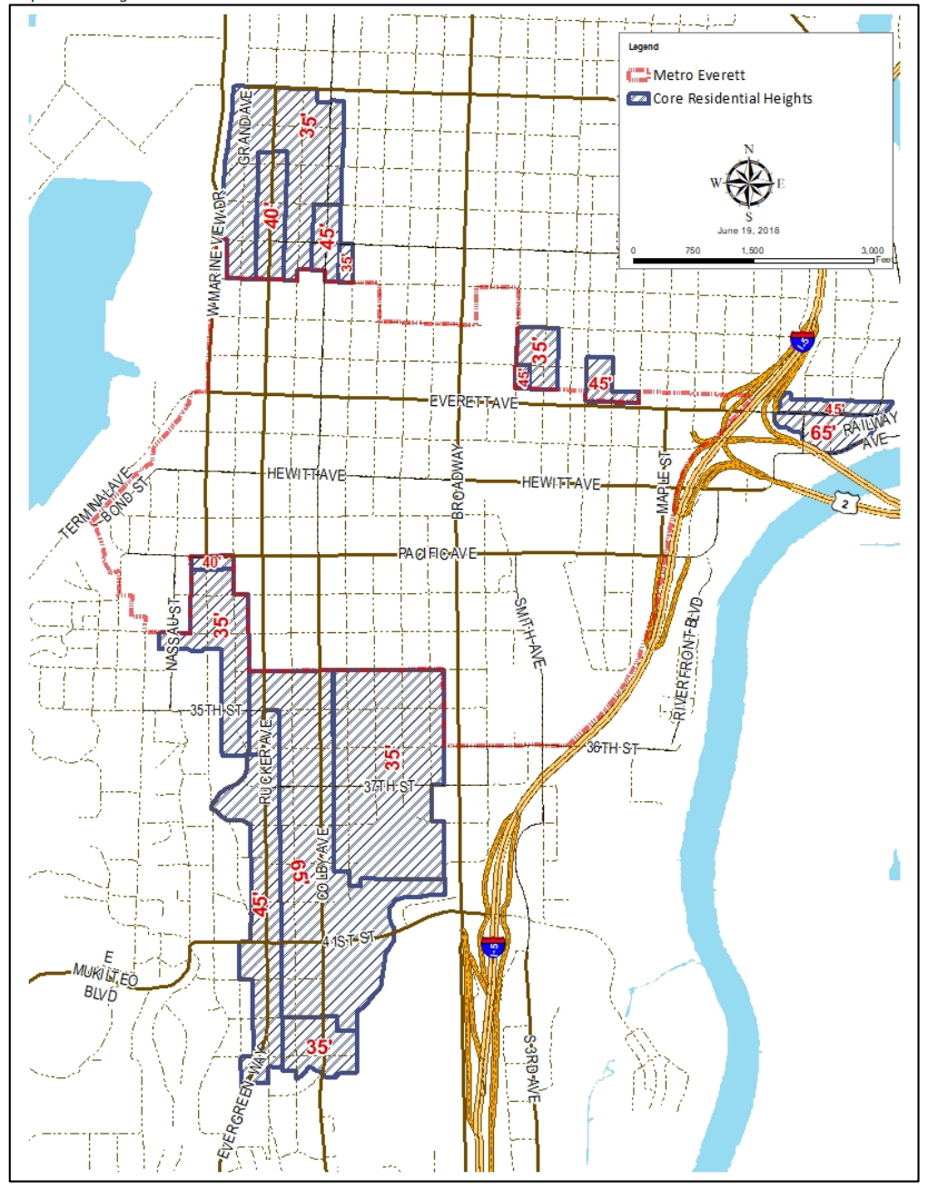- Core Residential Area. Beyond the bounds of Metro Everett, the city adopted a new overlay district for higher-density residential and semi-mixed-use. The Core Residential Area (CRA) overlay applies similar development standards as those contained in Metro Everett to existing zones, such as R-2 and R-3. The underlying zoning regulations still apply, except when superseded by the CRA overlay development standards. As part of the new CRA overlay, the city revised maximum building heights in some cases, allowing new buildings as tall as 65 feet near Colby Avenue.