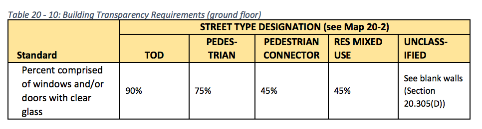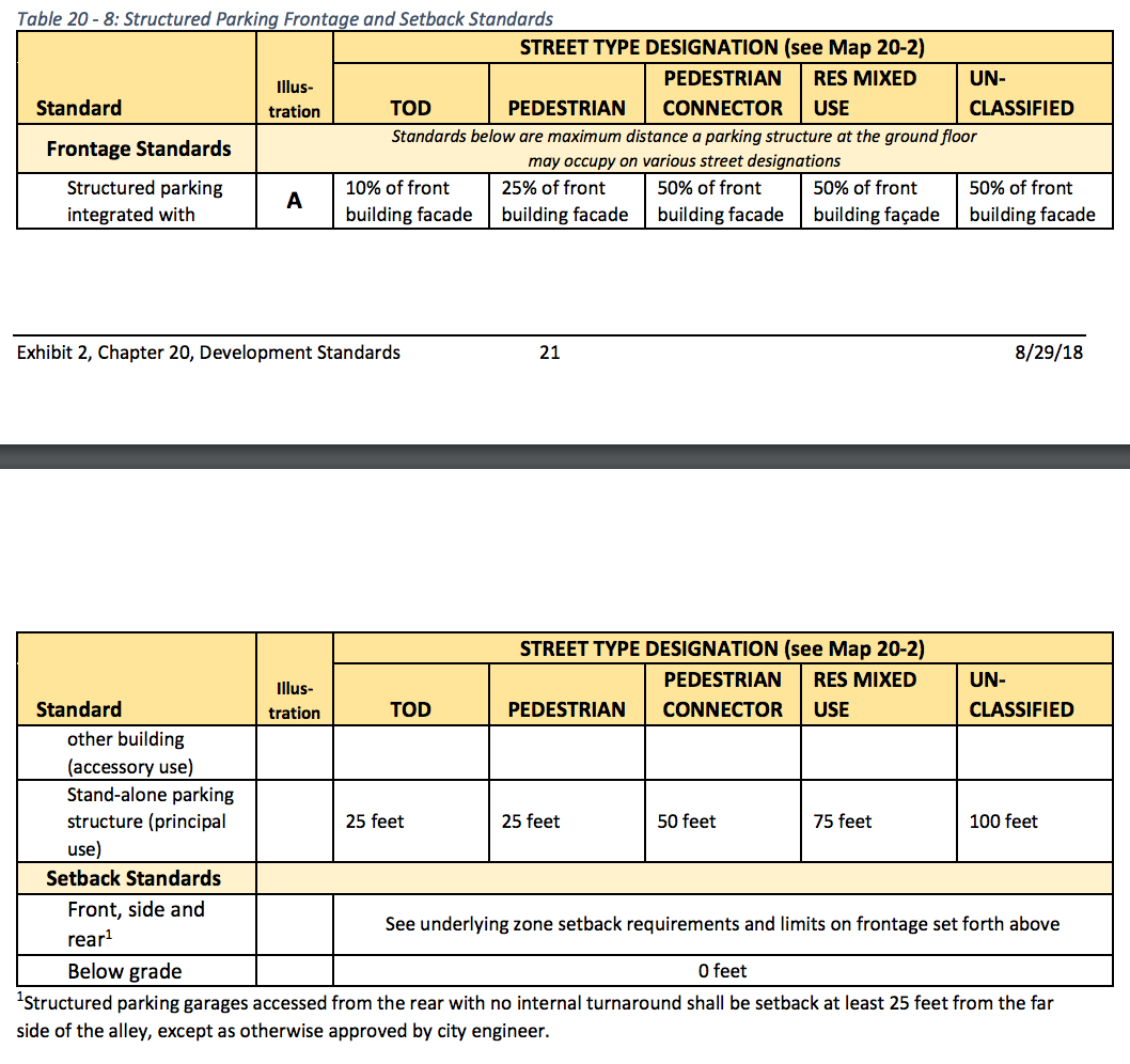 - Structured parking restrictions. Depending upon the street classification of a blockface, structured parking is subject to maximum frontage widths. The more active the street classification type, the less impactful structured parking is supposed to be.