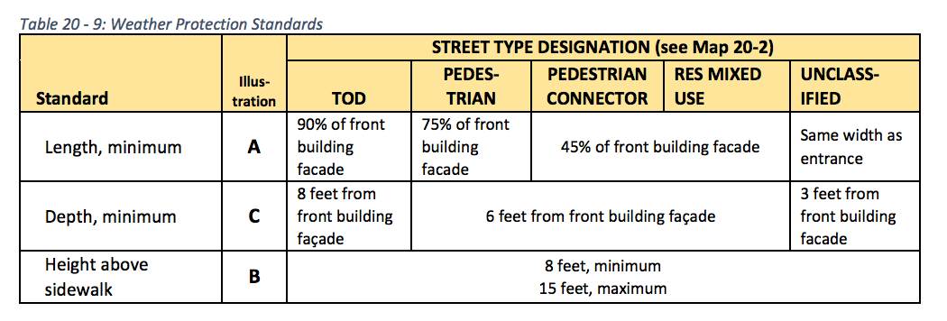 - Overhead weather protection. Overhead weather protection will need to meet specific standards depending upon the street classification of a blockface. TOD Streets will command a very robust amount overhead weather protection along street faces while unclassified blockfaces will essentially require none.