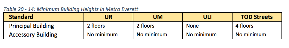 - Building heights. Building heights are regulated by an overlay map that specifies the maximum heights permitted. The lowest heights are planned for the edges of the Metro Everett area, generally at four or five stories. At the heart of the district, buildings could rise to 25 stories. Some areas have a range of allowed buildings heights, which indicate that incentives must be used to gain additional building height above the lower base maximum height. Examples of incentives that developers might choose include on- and off-site affordable housing, achieving green building standards, historic preservation, and providing public art and parking.