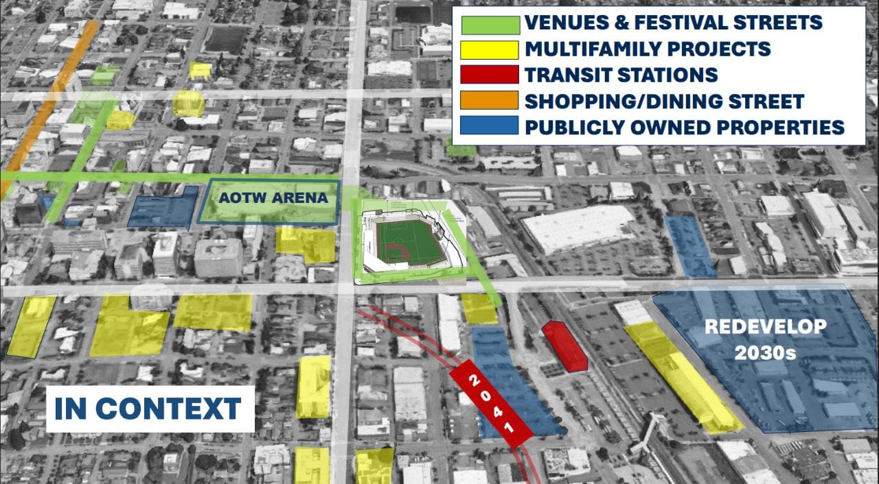 Everett chose the second option. On the eve of the new year, December 2024, the Everett City Council unanimously chose a site east of Angel of the Winds Arena — at the corner of Broadway and Pacific, right next to the Sounder rail line.