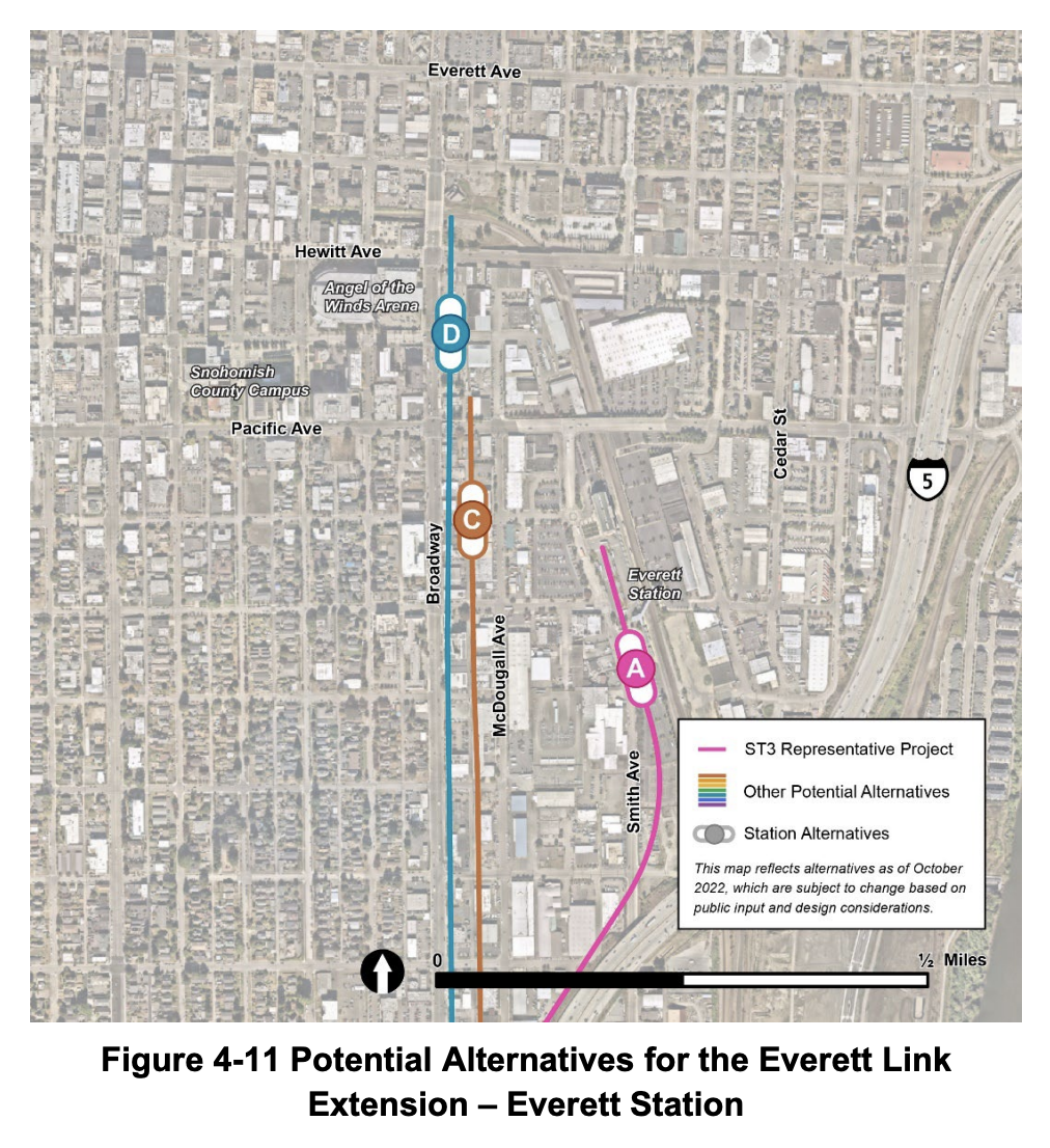 - Alternative EVT-D puts a station on the east side of Broadway immediately across from Angels of the Wind Arena, but five blocks from Everett Station. It also lacks bus connections and would require scores of property takings for reasons that just don’t make sense — again, just elevate the alignment and station in the middle of the street if this is going to be the chosen station location.