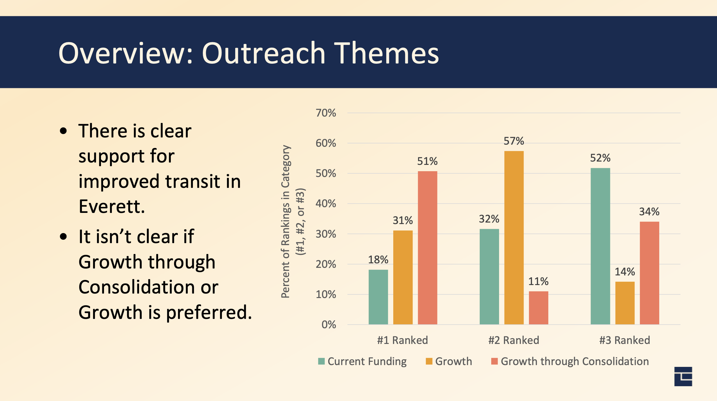 Everett ran a survey on the different options. There was a strong consensus that the status quo Current Funding approach is not desirable. Instead, people were generally supportive of Growth through Consolidation as a first choice, though many Everett residents also supported the Sustainable Growth option.